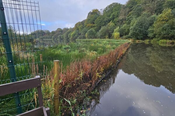 Salix mobilised to site and began to construct the linear island from Nicospan. It soon became apparent that the bottom half of the lake had been backfilled with rock and rubble during the construction of the dams during the 1970s. This put the whole project at risk as the stakes supporting the Nicospan could not be installed. Salix met with the council, fishing club and kayak club to openly discuss their requirements and what could be achieved considering the ground conditions.